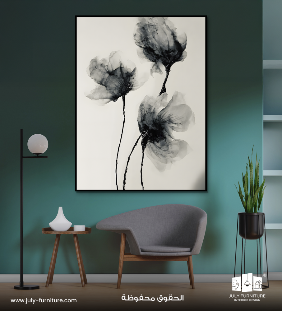 لوحة فنية أنيقة مستوحاة من جمال الزهور بتقنية الحبر التجريدي، حيث تندمج الظلال السوداء الشفافة بخلفية ناعمة لتعكس توازنًا فريدًا بين القوة والرقة.