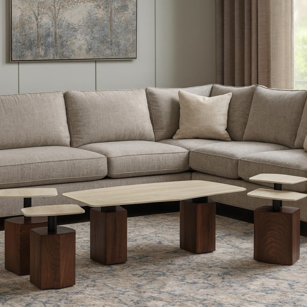 طقم طاولات بتصميم عصري فاخر يجمع بين الأناقة والفخامة، مثالي لغرفة المعيشة الحديثة. يتميز بتناسق جذّاب بين اللون الخشبي العميق وقمة الطاولة الفاتحة التي تضيف لمسة راقية للمكان. بفضل تصميمه الهندسي الفريد، يمنح الغرفة إحساسًا بالفخامة والتميز، سواء في الاستخدام اليومي أو أثناء استقبال الضيوف.