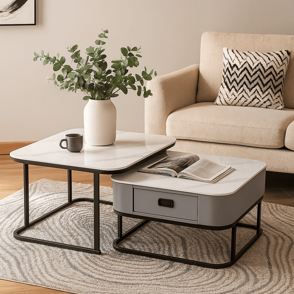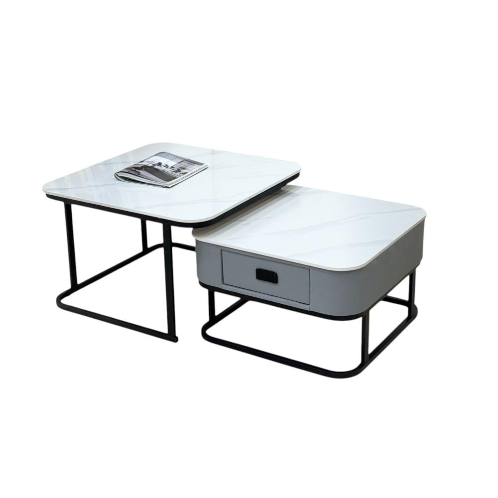 سطح الطاولتين المصمم بطابع السيراميك الابيض يمنح إحساسًا بالفخامة والنقاء، بينما تضيف القاعدة المعدنية السوداء لمسة من التوازن العصري المتقن.