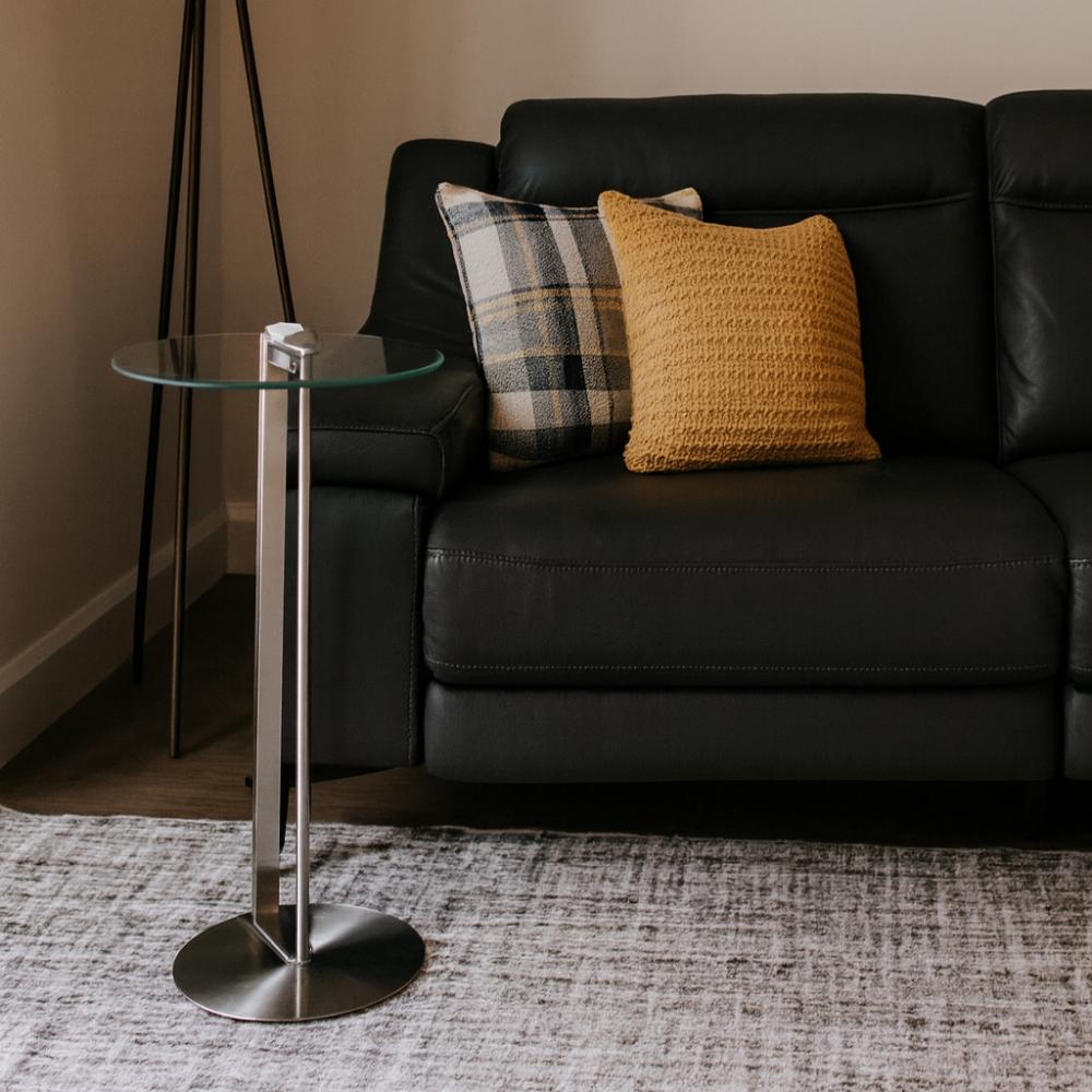 طاولة جانبية بتصميم عصري تجمع بين الأناقة والبساطة، تضيف لمسة فخمة إلى أي زاوية في غرفة المعيشة. تتميز بسطح زجاجي شفاف يمنحها مظهراً خفيفاً وانسيابياً، مع قاعدة معدنية متينة بلمسة فضية راقية تضفي طابعاً حديثاً على الديكور. مثالية لوضع فنجان القهوة، أو مزهرية صغيرة، أو قطعة ديكور أنيقة.