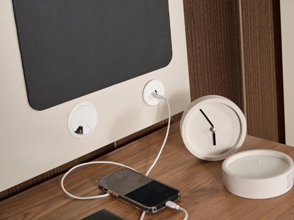 - منفذ USB: تم تزويدها أيضًا بمنفذ USB مُدمج، يستخدم في شحن الأجهزة الإلكترونية دون الحاجة إلى منافذ كهربائية في الغرفة، وهو حل عملي ومريح للغاية.