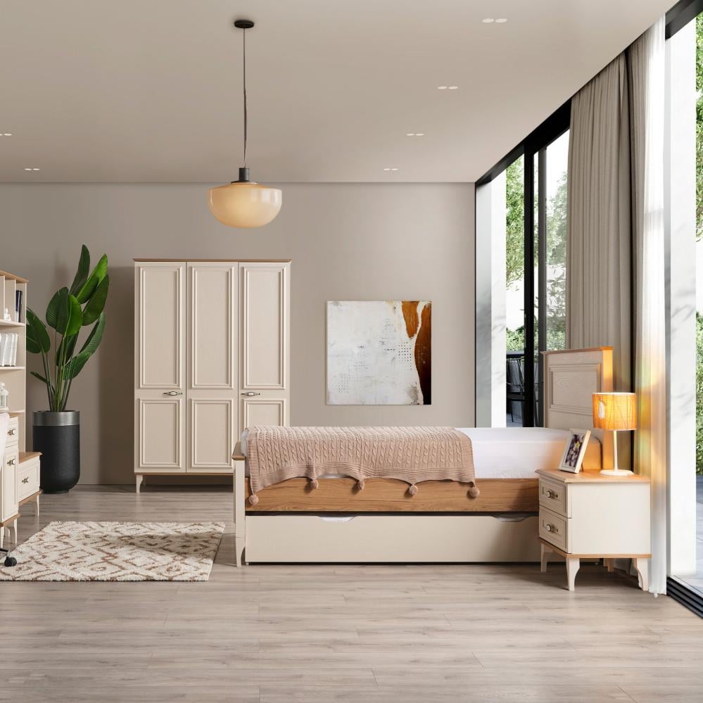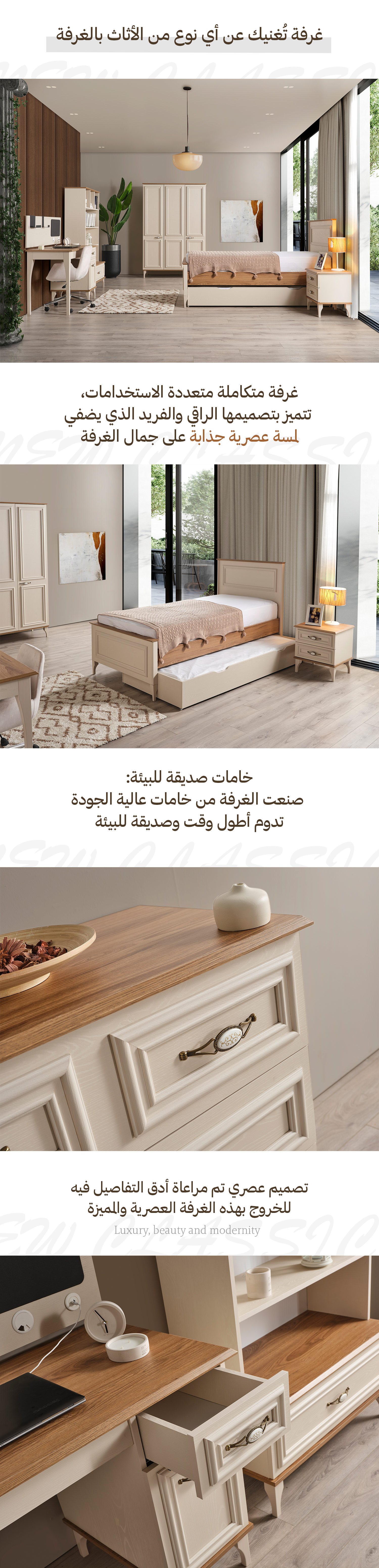- محتويات غرفة النوم تتكون من: (سرير فردي 100x200 طاولة سرير جانبية، خزانة ملابس 3 أبواب).