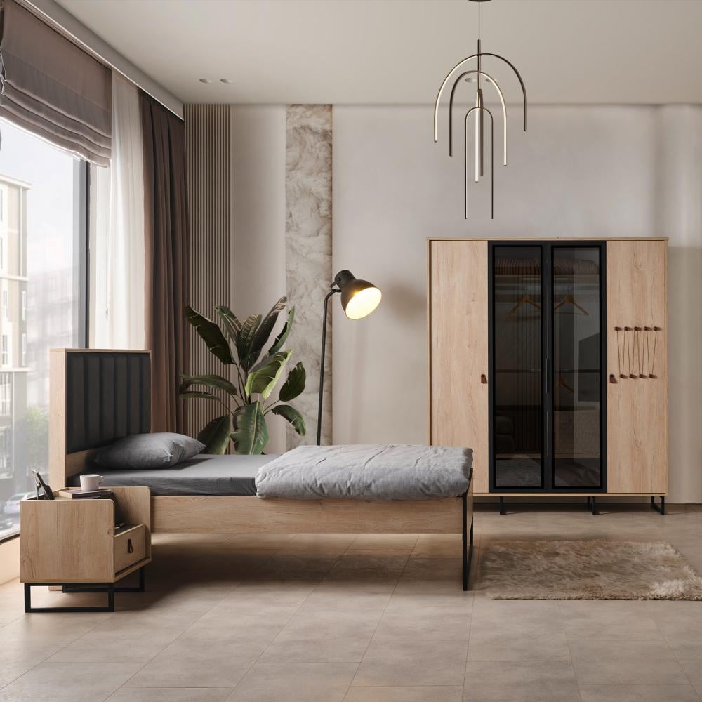 غرفة متكاملة: حيث نوفر لك سرير مفرد ودولاب بثلاثة أبواب وكمودينة كل هذا بمقاسات مختارة بعناية حتى لا يتسبب في تكدس الغرفة.
