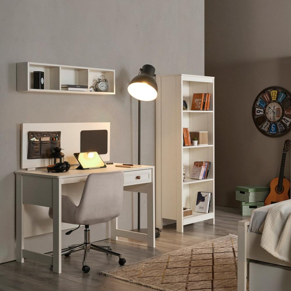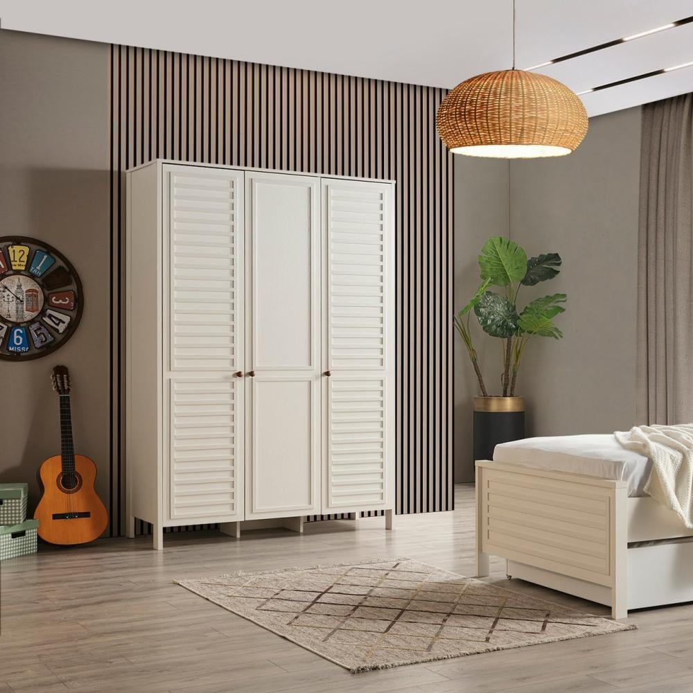 غرفة متكاملة: حيث نوفر لك سرير مفرد مع ميزة التخزين اسفل السرير ودولاب بثلاثة أبواب وطاولة كمودينة كل هذا بمقاسات مختارة بعناية حتى لا يتسبب في تكدس الغرفة.