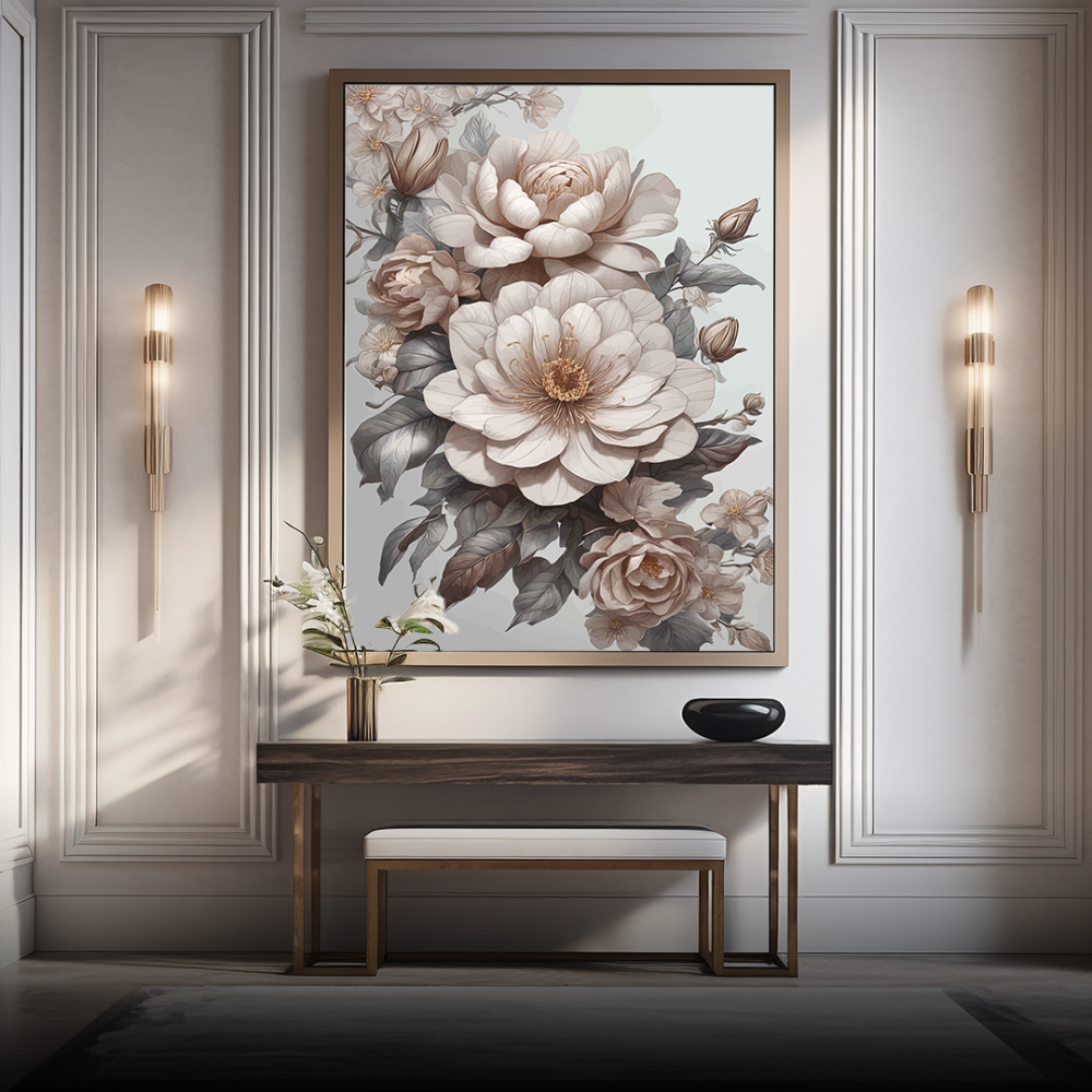 هذا العمل الفني الفاخر يُجسّد أناقة الزهور الكلاسيكية بلمسة عصرية راقية، ليكون الخيار المثالي لتزيين المداخل أو غرف المعيشة الفاخرة.