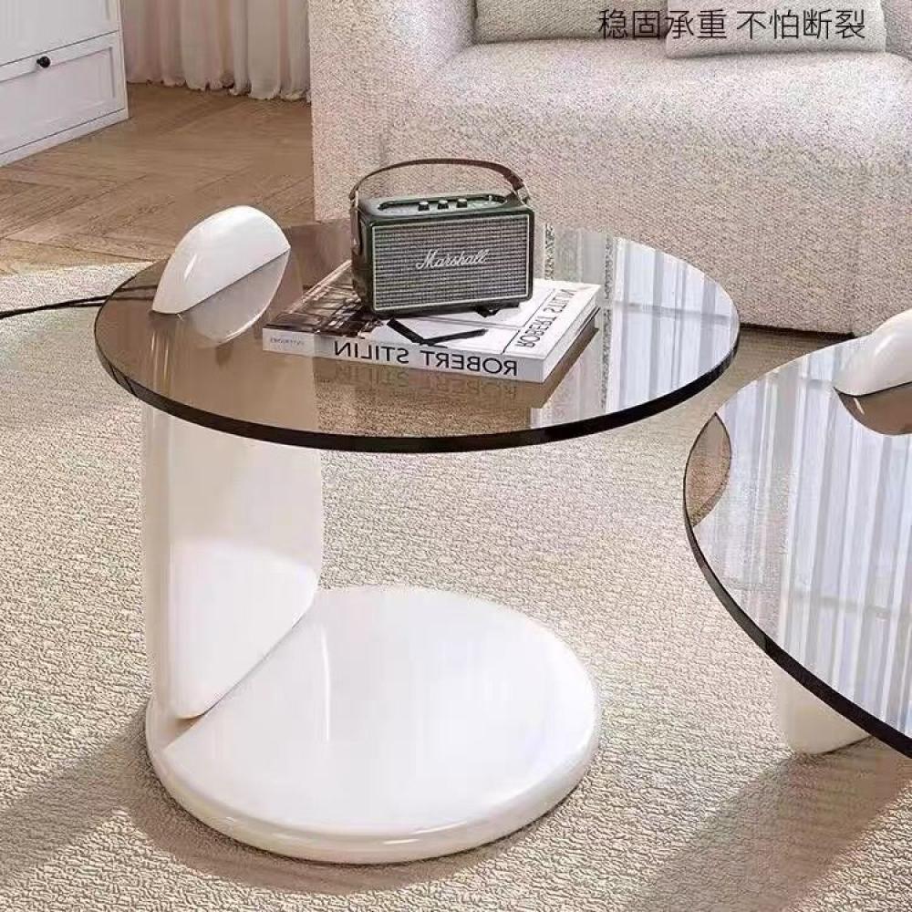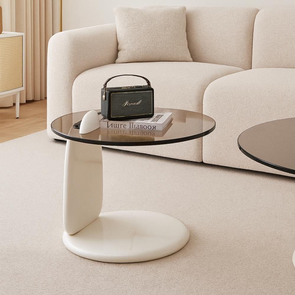 التصميم: تأتي بسطح زجاجي دائري شفاف وقاعدة خشبية باللون الأبيض مما يضفي مزيجاً من الدفء والحداثة على التصميم.