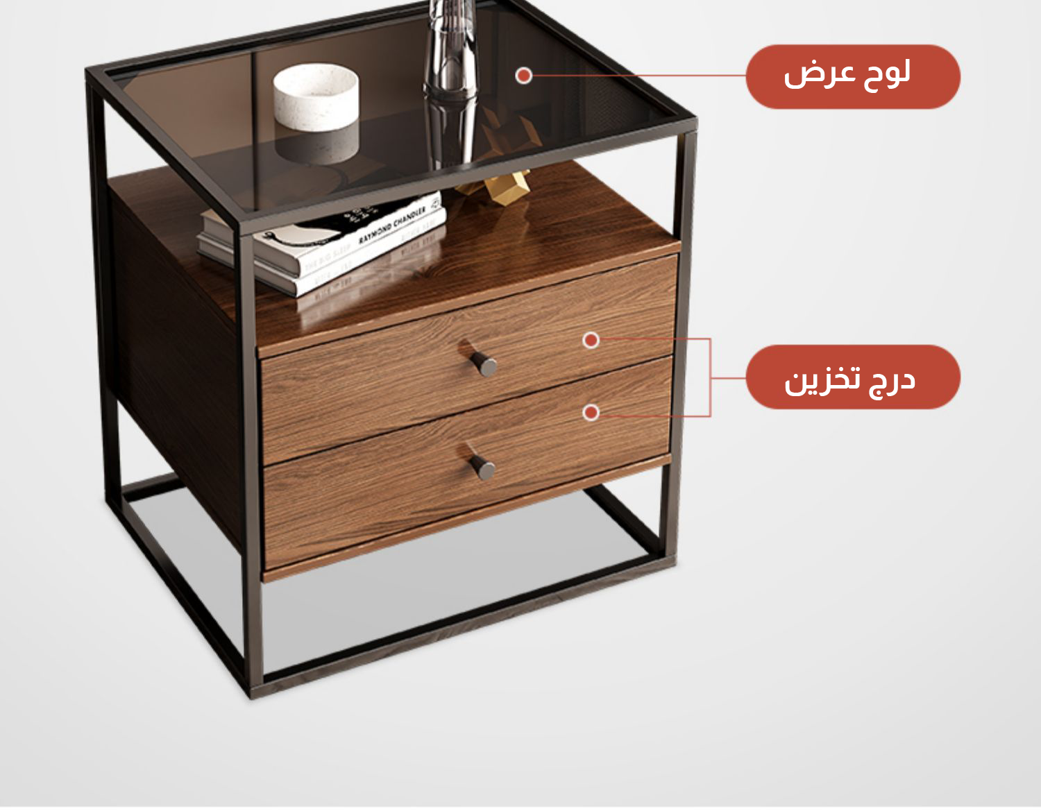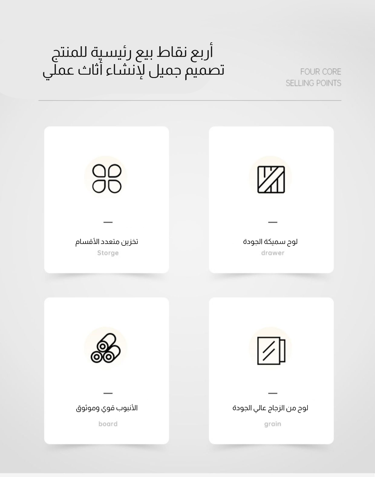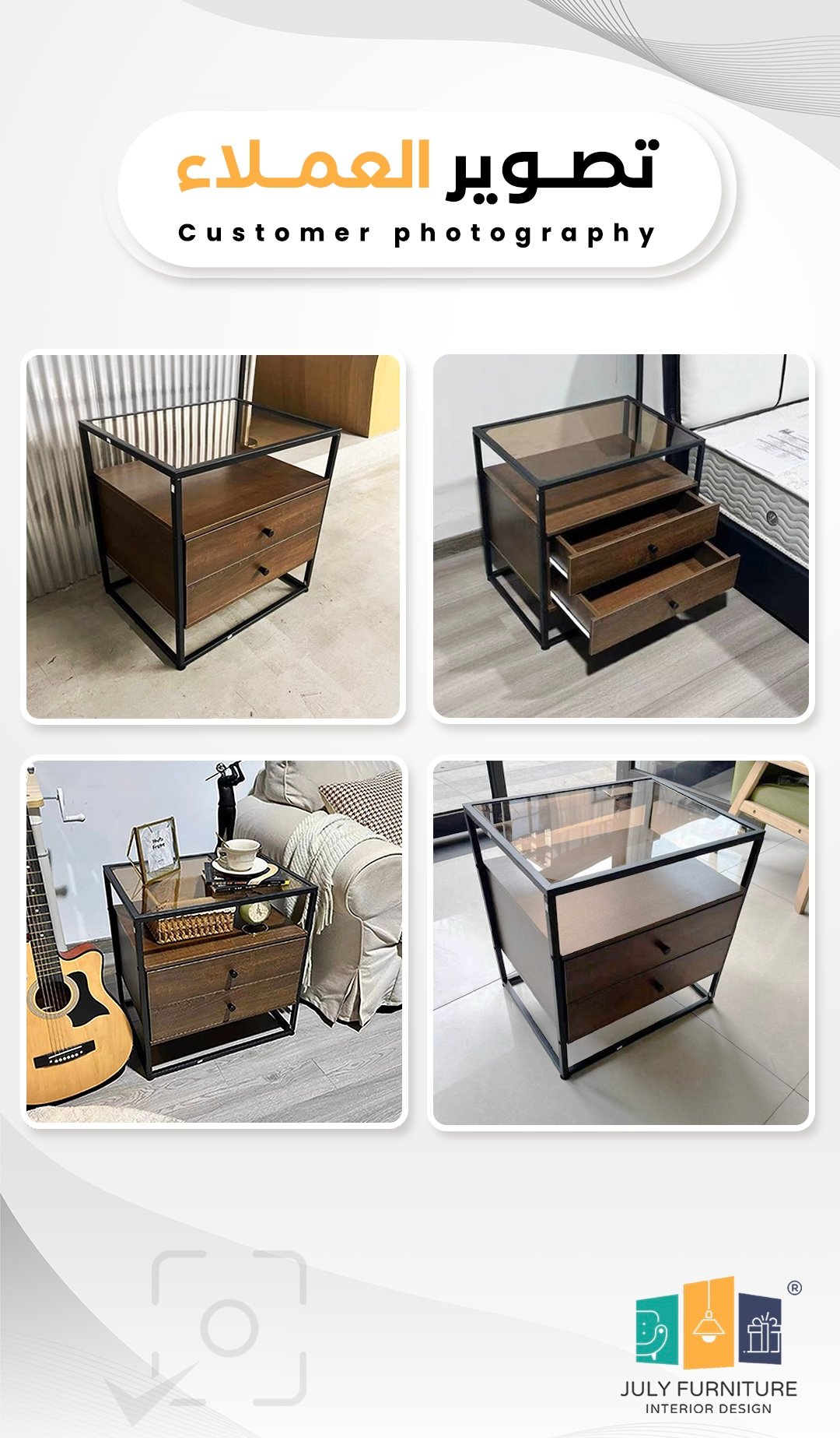 - مزود بأدراج سهلة الفتح والغلق، وبه مساحات كثيرة للتخزين، ويمكن وضع الأغراض على السطح الخشبي أو الزجاجي .