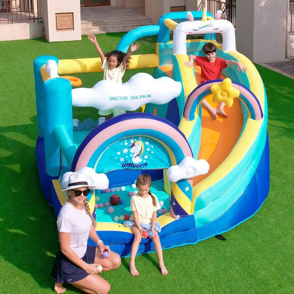 استمتع بتجربة لعب فريدة للأطفال مع قلعة القفز القابلة للنفخ ذات تصميم اليونيكورن المميز والألوان الزاهية. تجمع هذه القلعة بين المرح والأمان، حيث تضم منزلقًا ملونًا ومنطقة قفز واسعة تتيح للأطفال الاستمتاع بوقتهم في بيئة خيالية مليئة بالنجوم والسحب. إنها الإضافة المثالية لأي مناسبة أو حفلة، حيث توفر للأطفال ساعات من اللعب والمتعة.