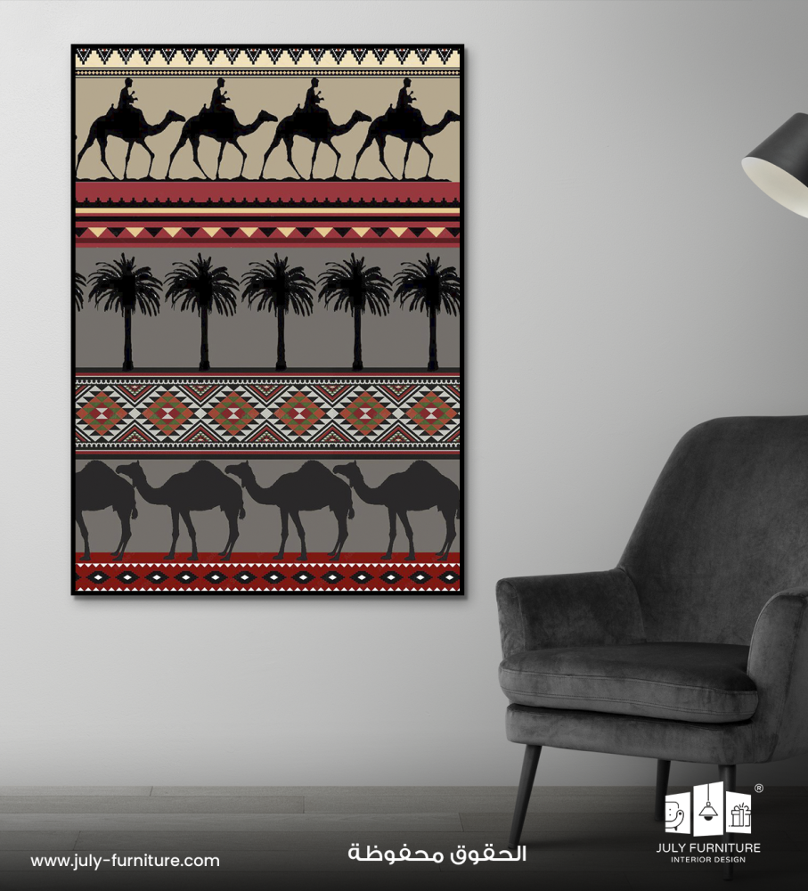 الجِمال والقوافل: في أعلى وأسفل اللوحة تظهر قوافل الجِمال، لتعكس أصالة الحياة البدوية ورمز الرحلات والسفر عبر الصحراء.
