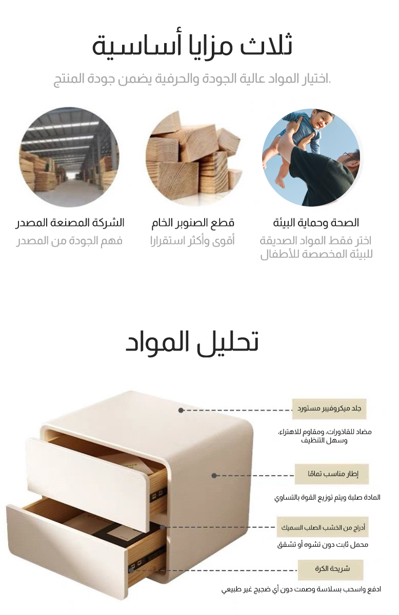 - جسم الكومدينه مصنوع من الخشب عالي الجودة الغير قابل للتقشير ولا يتغير مظهره ، كما إنه صديق للبيئة ومقاوم للحشرات والجراثيم ولا تظهر له أي رائحة .